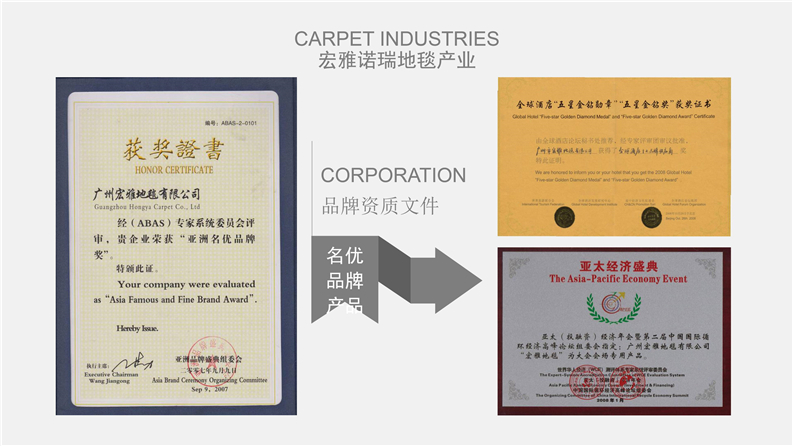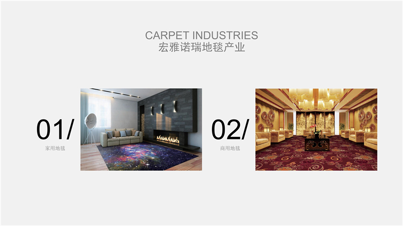 深圳宏雅諾瑞地毯有限公司自2008年創立以來,一直致力于星級酒店、辦公大廈及高端別墅會所提供高品質的產品與優質服務及領先國際水平的售后干洗技術培訓計劃,多年來不斷創新、優化產品結構,一直引領行業發展趨向,宏雅諾瑞地毯產業以綜合性加工生產中高檔機織及手工槍刺地毯為主,集產品研發、設計生產、銷售、鋪裝售后一體化的產業鏈生產企業,企業于2005年在廣州市花都區設立工廠至今,項目輻射全國各地城市地區。